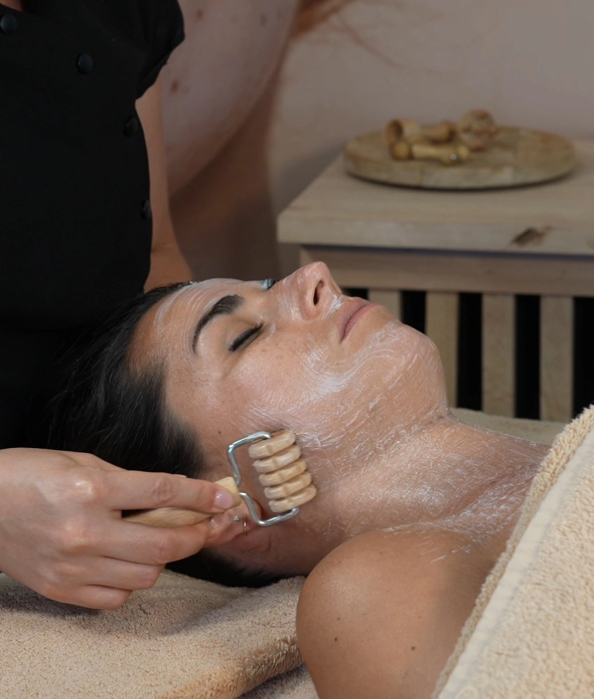 Le soin se poursuit par un massage liftant manuel, associé à la madérothérapie visage, alternant pressions, lissages et manœuvres drainantes à l’aide des instruments en bois.